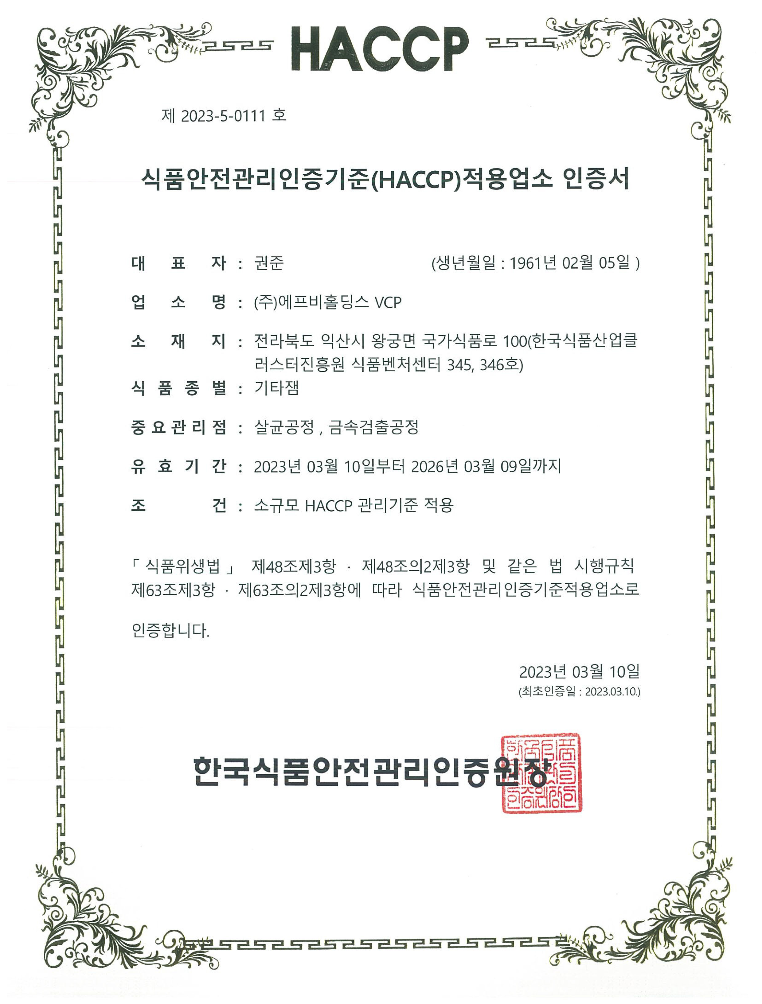 철저한 위생 및 안전점검을 통과한 상품으로 전세계의 소비자에게 안전하고 맛있는 먹거리 제공을 약속합니다.